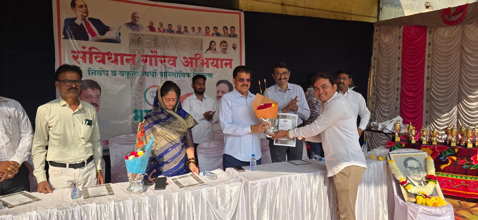 स्पर्धेतील विद्यार्थ्यांनी मान्यवर व परीक्षकांसमोर आपले वक्तृत्व सादर केले. त्यापैकी एका विद्यार्थ्याला वक्तृत्व स्पर्धेत निवड करण्यात आली तसेच निबंध स्पर्धेत प्रत्येक शाळेमधून प्रथम, द्वितीय, तृतीय विद्यार्थ्यांचा ट्रॉफी प्रमाणपत्र व भारतीय संविधानाची उद्देशिकाची प्रत देऊन त्यांचा सत्कार करण्यात आला. या निबंध व वक्तृत्व स्पर्धेचे लेखन केलेल्या विद्यार्थ्यांचे मुख्याध्यापक व शिक्षक वृंदांनी त्यांचे परीक्षण करून योग्य प्रकारे मूल्यांकन केले व त्यानुसार क्रमांक एक ते तीन पारितोषिके ठरवण्यात आली. त्यानिमित्त जळगाव लोकसभा मतदारसंघाचे नवनिर्वाचित खासदार श्रीमती स्मिताताई वाहक जळगाव शहराचे लाडके आमदार श्री राजू मामा भोळे मुख्य अतिथी म्हणून उपस्थित होते तसेच महानगर जिल्हाध्यक्ष सौ उज्वला बेंडाळे अनुसूचित जातीचे सरचिटणीस ज्योती निंभोरे ग्रामीण जिल्हाध्यक्ष ज्ञानेश्वर जळकेकर महाराज तसेच भारतीय जनता पार्टीचे ज्येष्ठ नेते व संघटक श्री राधेश्याम चौधरी भाजयुमचे सरचिटणीस रोहित सोनवणे समाजसेवक अतुल बारी नगरसेवक सुरेश सोनवणे विजय पाटील भाजपाचे सौ योगिता मालवी मुंदडे हायस्कूलचे मुख्याध्यापक डीएस कुमावत सर ग्रामविकास विद्यालयाचे मुख्याध्यापक श्री पंकज जोगी सर आदी मान्यवरांची उपस्थिती होती. तसेच या यशस्वी कार्यक्रमाचे आयोजन भारतीय जनता पार्टीचे आशिष सपकाळे यांनी केले होते. कार्यक्रमाचे सूत्रसंचालन श्री विशाल पवार सोबत इस्माईल खाटीक, हरी ओम सूर्यवंशी, शिवकुमार पुरोहित, राजू डोंगरे, प्रथमेश जोशी, निलेश परदेशी, कमलेश डांबरे, पवन सपकाळे, तसेच भारतीय जनता पार्टीचे पदाधिकारी व कार्यकर्ते उपस्थित होते.