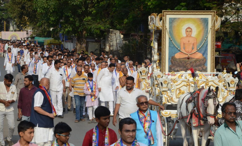 जळगावच्या काँग्रेसभवनासमोरील जैन मंदिराजवळून सुरूवातीस जैन तीर्थंकर प्रभू श्री महावीर स्वामी जन्मकल्याणक महोत्सव समिती २०२५ यांनी वरघोडा व विविध दृष्यांची झाकी, शोभायात्रा काढली. तसेच कलशधारी महिला व युवक युवतींनी या शोभायात्रेने लक्ष वेधून घेतले होते. ही मिरवणूक सराफ बाजाराकडून पुढे जात खुल्या बालगंधर्व नाट्यगृहापर्यंत जवळजवळ नऊ वाजता पोहोचली. त्यानंतर तिथे भगवान महावीर जन्मकल्याणक महोत्सवाच्या कार्यक्रमांना सूरूवात झाली. सर्वात प्रथम जैन धर्माच्या झेंड्याला ध्वजवंदन करण्यात आले. त्याच्या सन्मानार्थ एका गीताचे गायन झाले.