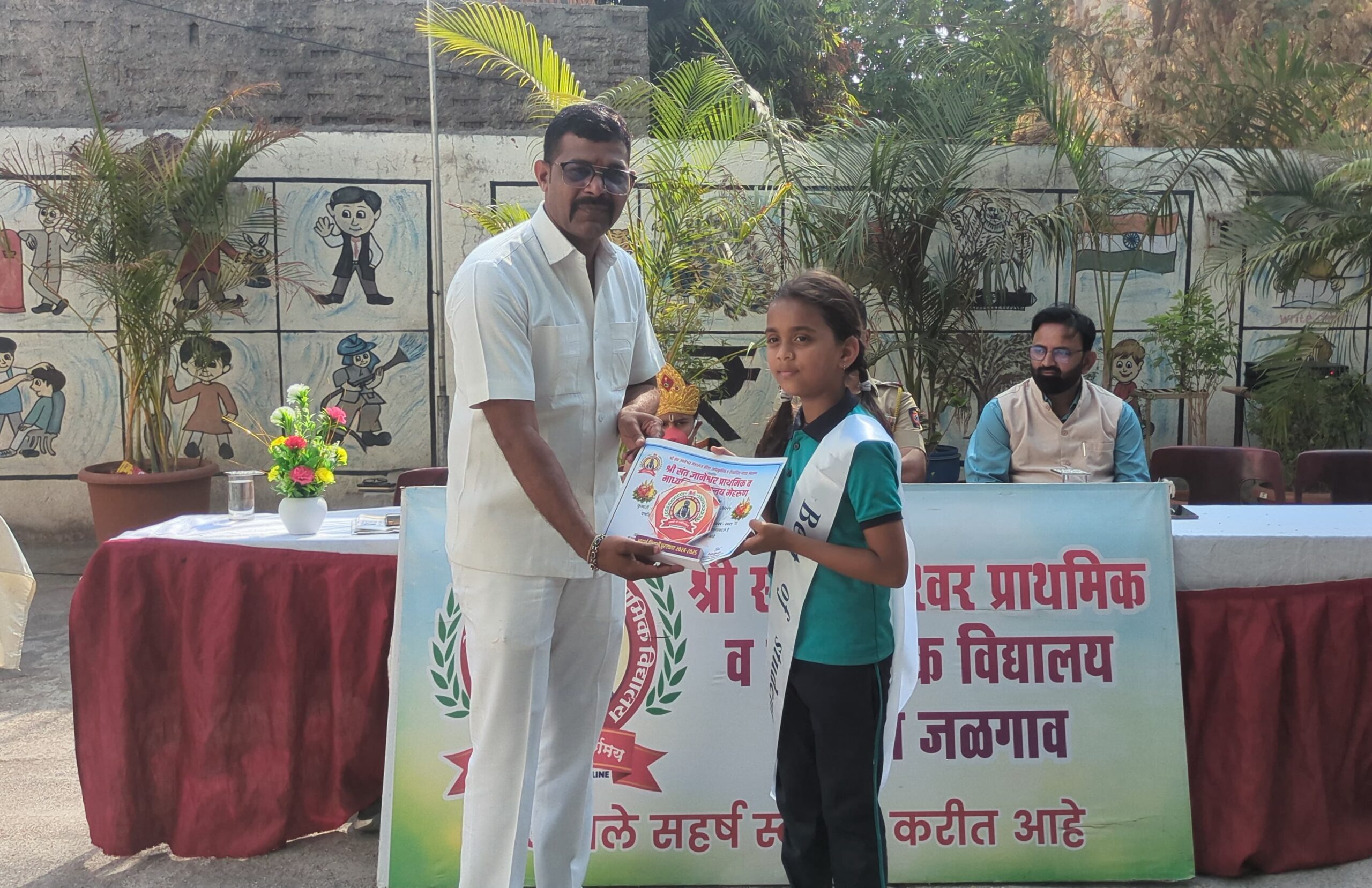 जळगाव, दि.12 (जनसंवाद न्युज): श्री संत ज्ञानेश्वर प्राथमिक व माध्यमिक विद्यालयात हनुमान चालीसा पठण व विद्यालयात २०२४ -२५ या शैक्षणिक सत्रात उत्कृष्ट कामगिरी करणाऱ्या विद्यार्थ्यांसाठी पुरस्कार वितरण समारंभ आयोजित करण्यात आला होता. कार्यक्रमाची सुरुवात प्रमुख पाहुणे म्हणून एम.आय.डी.सी पोलीस स्टेशनचे पोलीस उपनिरीक्षक संदीप पाटील यांनी विद्येची देवता सरस्वती मातेला पुष्पहार अर्पण करून आणि दीपप्रज्वलन करून झाली.