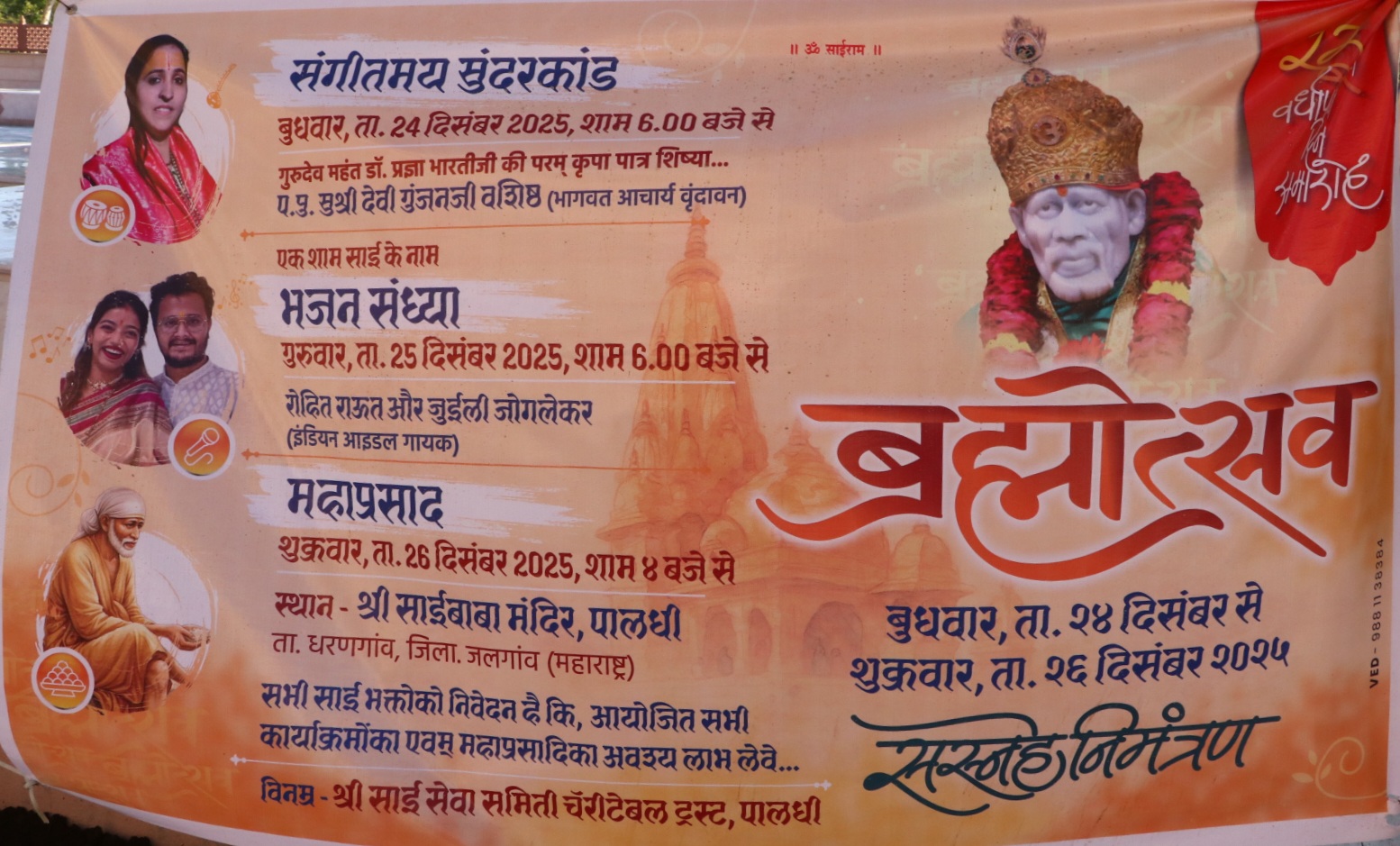 जळगाव, दि. 24 (जनसंवाद live): पाळधी येथील साई मंदिरात आज पासुन तीन दिवस ब्रम्होत्सव सुरू होत आहे. श्री साई सेवा समिती चॅरिटेबल ट्रस्ट पाळधी तर्फे दर वर्षी ब्रम्होत्सवाचे आयोजन करण्यात येते. हे वर्ष ब्रम्होत्सवाचे 23 वे वर्ष असून तयारी पूर्णत्वास आली आहे.